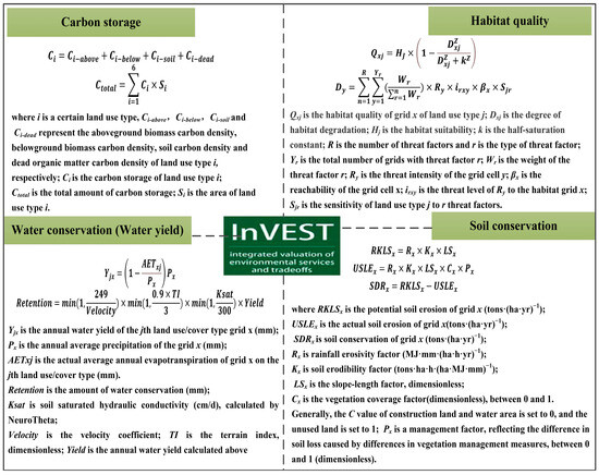This study used multiple modules of the InVEST model (Figure 2), a model system used to assess ESs in order to support ecosystem management and decision making. The module was set by referring to the InVEST Model User Guide [44] and to previous research results [45,46]. The specific setting parameters are shown in Table 2 and Table 3.
