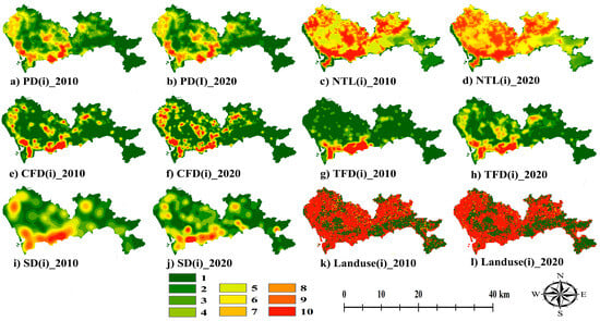 where Value(i) represents the HAI, landuse(i) is the land use index after assignment quantification, PD(i) is the population density after assignment quantification, TFD(i) is the transport facility density index after assignment quantification, SD(i) is the scenic spot density index after assignment quantification, NTL(i) is the night-time lighting index after assignment quantification, and CFD(i) is the commercial facility density index after assignment quantification (Figure 3).