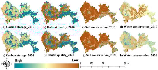 This study used the InVEST (Version 3.10.2) model to quantify and spatially map ESs in the study area. From 2010 to 2020, the average levels of water conservation, soil conservation, carbon storage, and habitat quality showed general downward trends. Furthermore, from 2010 to 2020, the spatial patterns of ESs were similar.