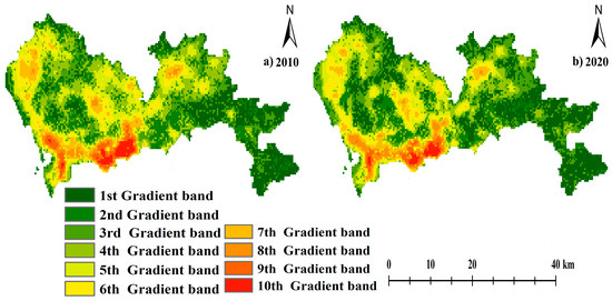In this study, based on the HAI assessment results, we classified 10 gradients with the help of the average breakpoint method, in which the first gradient band was 0 < HAI ≤ 6, the second gradient band was 6 < HAI ≤ 12, the third gradient band was 12 < HAI ≤ 18, the fourth gradient band was 18 < HAI ≤ 24, the fifth gradient band was 24 < HAI ≤ 30, the sixth gradient band was 30 < HAI ≤ 36, the seventh gradient band was 36 < HAI ≤ 42, the eighth gradient band was 42 < HAI ≤ 48, the ninth gradient band was 48 < HAI ≤ 54, and the tenth gradient band was 54 < HAI ≤ 60. In terms of the spatial scale, there was significant spatial variability in the HAI (first gradient band to tenth gradient band), with HAI in the western part of the study area being higher than that in the eastern part. Among the gradients, the eighth to the tenth bands were mainly concentrated in the southwestern part of the study area, and were located in the region where construction land was concentrated. The first to the third gradient bands were mainly concentrated in the southeastern part of the study area and located in regions with high vegetation cover; the fourth to the seventh gradient bands were mainly concentrated in the northwestern, northeastern, and central parts of the study area. At the same time, the high-intensity regions in the study area were surrounded by medium-intensity areas, while the medium-intensity areas were surrounded by low-intensity areas (Figure 5).