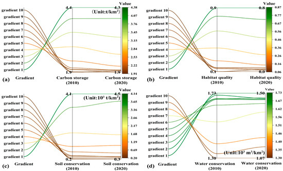 The ESs under gradient bands with different HAIs were summarized and mapped. When the HAI increased (1st–10th gradient bands), carbon storage, habitat quality, soil conservation, and water conservation showed decreasing trends in both 2010 and 2020. Among these, the average values of each ES reached high values in the first gradient band, whereas the average values of each ES in the ninth or tenth gradient band reached low values (Table 6). In addition, the variations in carbon storage, habitat quality, and soil conservation were relatively similar. There was a stepwise decrease in the levels of the three services in the 1st–6th gradient bands, and a more gradual change in the levels of the three services in the 7th–10th gradient bands; the change trends in water conservation were somewhat different. In the 1st–6th gradient bands, the range of service changes was small, while, in the 7th–10th gradient bands, there was a stepwise decrease in the service (Figure 7a–d).