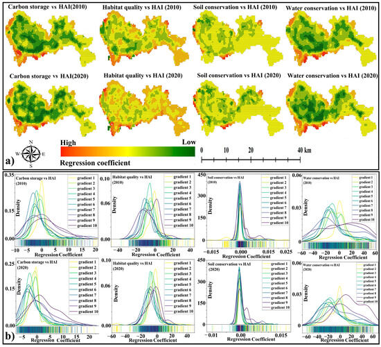 In 2010 and 2020, the regression coefficients of ESs on HAI were somewhat different. The highest values of positive regression coefficients of carbon storage on HAI were 20.34 (2010) and 21.95 (2020), which were located in the first gradient band; the lowest values of negative regression coefficients were −9.23 (2010) and −7.67 (2020), which were located in the eighth gradient band. The highest values of positive regression coefficients of habitat quality on HAI were 59.91 (2010) and 47.99 (2020), and the lowest values of negative regression coefficients were −52.31 (2010) and −54.71 (2020), which were located on the first gradient band. The highest value of positive regression coefficients of water conservation on HAI were 50.21 (2010) and 51.04 (2020), which were located in the first gradient band, and the lowest values of negative regression coefficients were −67.31 (2010) and −69.73 (2020), which were located in the fourth and second gradient bands, respectively. The highest values of positive regression coefficients for soil conservation on HAI were 1.02 (2010) and 1.04 (2020), which were located in the first gradient band, and the lowest values of negative regression coefficients were −1.02 (2010) and −1.01 (2020), which were located in the seventh and third gradient bands, respectively (Figure 9b).