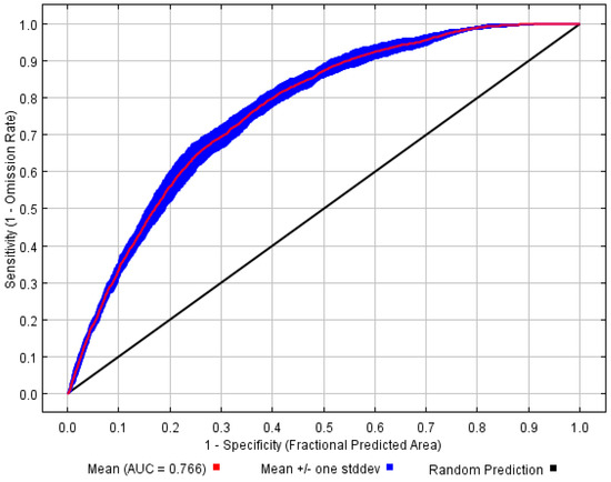 The area under the curve (AUC) is a graph of sensitivity (how well the data correctly predicts presence) and specificity (how well the data correctly predicts absences). The AUC values vary between 0.5 and 1, with the former indicating a model that is no better than chance and the latter providing increasingly better discrimination as it approaches 1, i.e., 0.5–0.6 = no discrimination; 0.6–0.7 = discrimination; 0.7–0.8 = acceptable; 0.8–0.9 = excellent; 0.9–1.0 = exceptional [49]. The SDM MaxEnt model for Asiatic Lion showed an AUC of 0.766 (SD = 0.014), which represents an acceptable performance of the model given the large sample size (Figure 2).