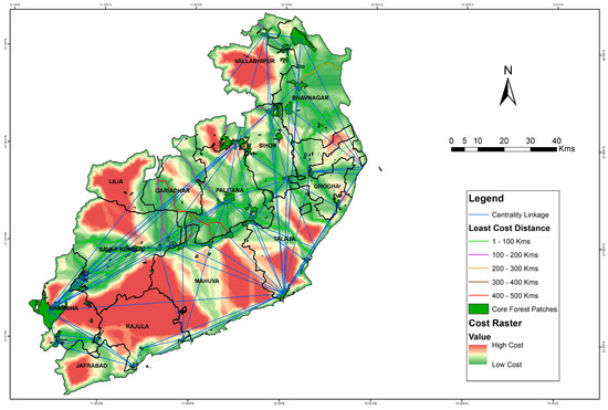 The results of the corridor analysis have three outputs: (a) corridor linkages, (b) multiple paths, and (c) prominent corridor patches. The centrality links connecting all core forest patches (notified forests) show how the core regions are interconnected and could serve as alternative habitats for the lion population (Figure 5). The central patch covering the core forest patches (notified forests) has several connections from west to east, but alternative connections exist from the southern coastal routes (Figure 5). However, based on the estimation of cost-raster least-cost paths, the coastal routes have few multi-link- routes running west to east from Gir Sanctuary to Velavadar (Blackbuck) NP through the Notified Forest patches in the middle (Figure 6).
