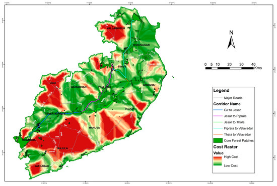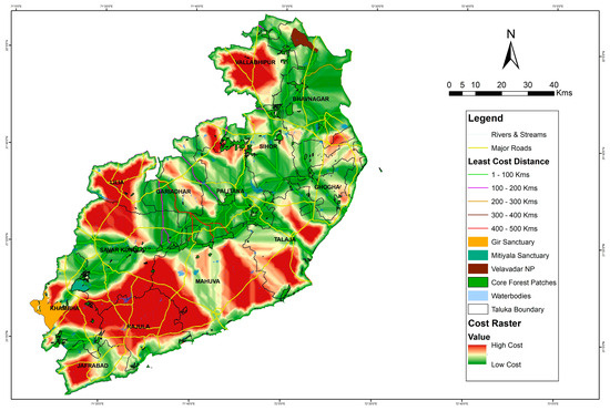 The particularly suitable habitat areas were the core areas (forest patches aka Notified Forests) starting from the west of the study area towards the east from Khambha to Palitana sub-districts (Figure 1 and Figure 3). Therefore, we selected these notified forests as core areas for the following corridor analysis, described in detail in the following sub-section. In addition, some of the coastal habitats to the south were also moderate to highly suitable.