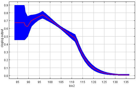 Marginal response curve of bio2 Mean Diurnal Temperature Range with a predicted probability of presence (cloglog output; in blue). Note: The Bio2 values (in °C) are scaled by a factor of 10.