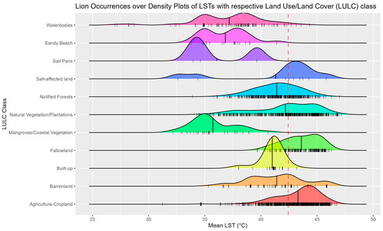 Ridge Plot of Mean LSTs (2018–2019) with respective Land Cover class in lion occurrence locations. Note: the Black jitter data points are shown as ‘|’, LST ranges (in °C) are shown in the density plots in each land cover class and Red line shows overall mean (42.4 ± 2.7 °C).