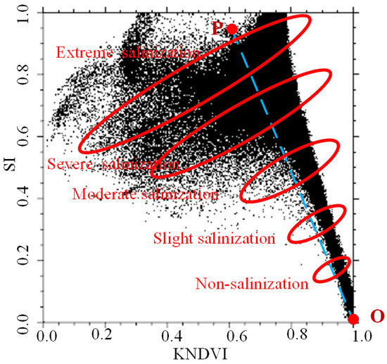 Figure 4 shows the KNDVI-SI feature space remote sensing monitoring model. The straight-line OP successfully distinguished between different soil salinization levels. The distance from any point to point O (1, 0) in the feature space explains the salinization degree. In other words, the farther the distance from point O, the more severe the salinization degree. According to the feature space, salinization is divided into five parts: extreme salinization, severe salinization, moderate salinization, mild salinization and non-salinization. By selecting different point groups from the measured points, the salinization law is revealed, that is, the closer the O point, the slighter the salinization degree; the ellipse is used to more directly show the salinization degree of different grades in the feature space, which is convenient for the quantitative expression of the law and establishment of an exponential model. The exponential model was used to invert different degrees of salinization. The natural breaks method [26] and field measured data were used to find the grading standards and determine the thresholds of different grades. The specific threshold grading standards are shown in Table 2, so as to better show the degree of salinization of different grades. From the figure, we can see the distribution law of the salinization degree. The red circle in the figure represents the typical distribution area of each grade, and the specific grading standard refers to Table 2.