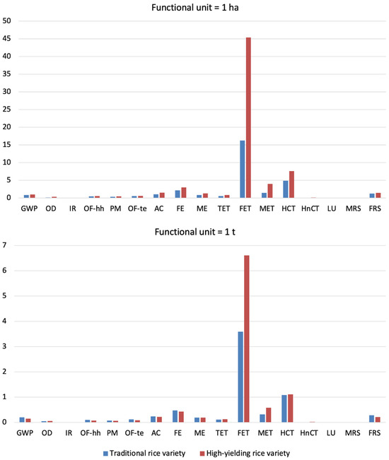 Characterized impacts. Functional = 1 t paddy yield; GWP = global warming potential; OD = ozone depletion; IR = ionizing radiation; OF-hh = photochemical oxidant formation: human health; PM = fine particulate matter formation (PM); OF-te = photochemical oxidant formation: terrestrial ecosystems (OF-te); AC = terrestrial acidification (AC); FE = freshwater eutrophication; ME = marine eutrophication; TET = terrestrial ecotoxicity; FET = freshwater ecotoxicity; MET = marine ecotoxicity (MET); HCT = human toxicity: cancer (HCT); HnCT = human toxicity: non-cancer (HnCT); LU = land use; MRS = mineral resource scarcity; fossil resource scarcity (FRS); TRV = traditional rice varieties; HRV = high-yielding rice varieties; t = t-test; U = Mann–Whitney test. Statistical significance: p < 0.05. Source: Authors’ elaboration.