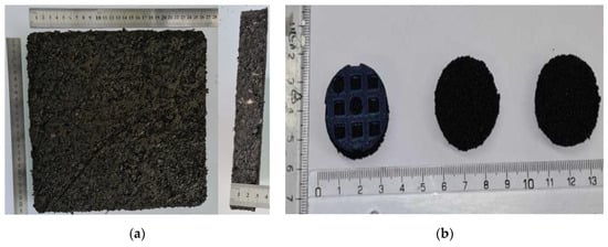Rubber granulate plate samples. (a) Rubber granulate plate prepared for use in the test structure; (b) samples of rubber granulate prepared for interferometer analysis (d = 30 mm).