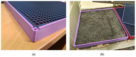 Perforated cartridges for installing the rubber granulate plate. (a) The 3D-printed cartridge without the rubber granules; (b) the 3D-printed cartridge filled with the rubber granulate.