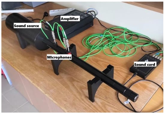 The interferometer-based method for the measurements of the sound transmission loss is commonly referred to as the four-microphone method, with two microphones mounted in front of the test sample and the other two microphones behind it. A 4-microphone and single-load system is used to research the sound transmission loss; the corresponding diagram is shown in Figure 6. Experimental measurements were made in accordance with ASTM E2611-19 [35].