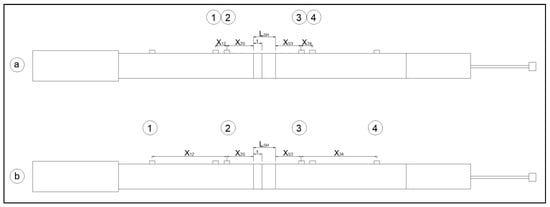 Schematic representation of the impedance tube setup for conducting experimental measurements of sound transmission loss. 1, 2, 3 and 4 are marks of the measurement positions where the microphones are installed. (a) Setup for measuring the frequency range 1000–5000 Hz. (b) Setup for measuring the frequency range 160–1000 Hz.