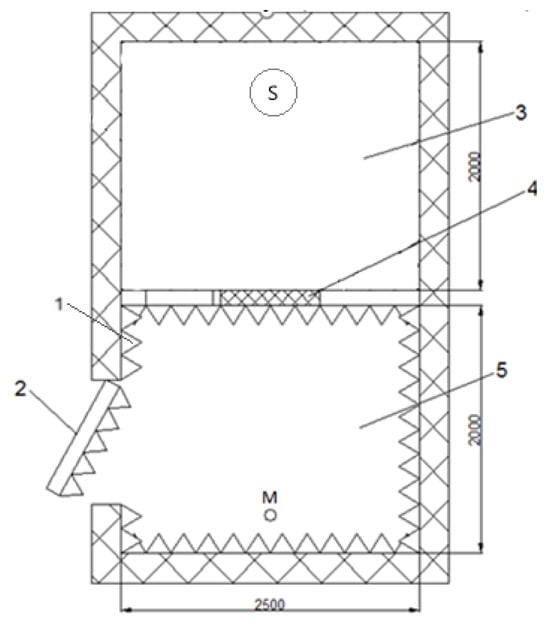 General top view of the sound absorbing chamber. 1—foam covered with acoustic foam, 2—doors, 3—sound transmission room, 4—structure installation space, 5—sound reception room, M—microphone position, S—noise source.