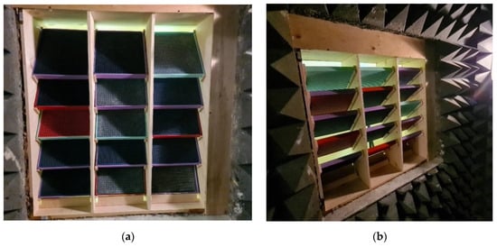 Structure with rubber granulate plates at different angles directed to and from the noise source. (a) Louvers tilted towards the noise source; (b) louvers tilted away from the noise source.