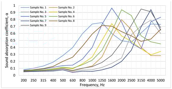 The investigation of the sample sound absorption with the use of an interferometer proves that the highest efficiency in sound absorption was in the range of medium (500 Hz to 1600 Hz) and high (1600 Hz to 5000 Hz) frequencies. This consistent pattern was observed in all the tested samples. The analysis of the results showed that in the low frequency range (160 Hz to 500 Hz), samples No. 1, No. 5, and No. 8 were the best in sound absorption. At a frequency level of 500 Hz, the sound absorption ratio (α) was 0.28, 0.14, and 0.20, respectively. In the medium frequency range (500 Hz to 1600 Hz), these samples are marked by a good consistent result and at 1000 Hz they reach the values of 0.74, 0.40, and 0.59, respectively. A similar pattern also remains in the high frequency band (from 1600 Hz to 5000 Hz), where at the 5000 Hz limit, the sound absorption ratio (α) is equal to 0.73, 0.82, and 0.66, respectively. To summarize the sound absorption results of the samples tested with the use of an interferometer (in the full frequency band), it can be stated that samples No. 1, No. 5, and No. 8 showed the best sound absorption performance. Similar results were obtained by Iannace G, who analyzed the sound absorption of materials obtained from the shredding of worn tires. Measurements of the absorption coefficient were made using a Kundt tube in the range from 200 Hz to 2.0 kHz. The results show that materials with a rigid skeleton and a thickness of 20 to 30 mm and particle sizes ranging from 2 to 4 mm and 4 to 6 mm exhibit peaks of absorption in the frequency range from 1400 Hz to 2000 Hz [37]. The thickness (30, 24, and 21 mm), density (0.772, 0.560, and 0.757 g/cm3), and fraction size (4–8, 4–15, and 2–8 mm, respectively) of rubber tire granulate were found to have the most significant impact on the sound absorption in the samples.