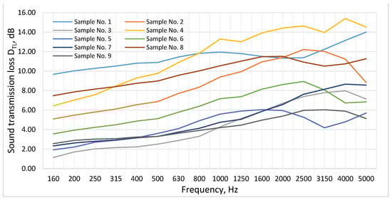 The presented results show that the samples which were the most effective in reducing sound transmission were No. 4, No. 1, and No. 8. Sample No. 1 (160 Hz to 500 Hz) was significant in the low frequency band. The sound transmission loss (DTL) in this sample ranged from 9.67 dB to 10.89 dB. The results of the samples No. 4 and No. 8 at 500 Hz were 9.77 dB and 8.98 dB, respectively. In the medium frequency range (500 Hz to 1600 Hz), these samples were marked with a good consistent result and at 1000 Hz they reached 13.28 dB, 11.94 dB, and 10.54 dB, respectively. In the high frequency band (1600 Hz to 5000 Hz), most of the sound was lost as the sound waves propagated through sample No. 4, and at the 4000 Hz limit, the sound loss (DTL) was equal to 15.39 dB. The results of the samples No. 1 and No. 8 at the level of the same frequency were 13.15 dB and 10.74 dB, respectively. The thickness and density of the rubber tire granulate were proved to have the most significant impact on sound loss in the samples. In this case, density determines the amount of free air gaps in the rubber granulate. This factor affects the porosity, with the increase in which sound loss during the propagation through the test material shows worse results.