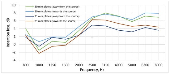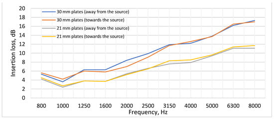 During the experimental measurements, the omnidirectional loudspeaker “Brüel & Kjær The OmniPower Sound Source Type 4292-L” was used as a sound source. White noise was used for sound attenuation testing. Sound insertion loss was measured from 800 Hz to 8000 Hz using 1/3 octave band filtering. During A-weighted insertion loss LAeq measurements, the LAeq of the source was 95.0 dB. The spectrum involved ranged from 160 to 8000 Hz.
