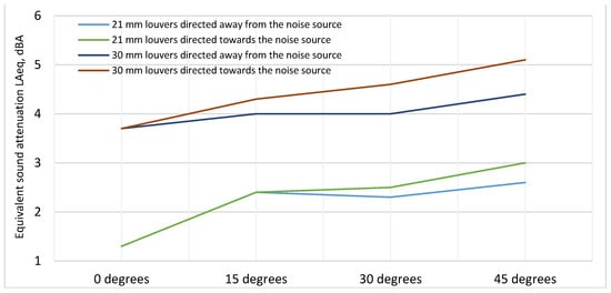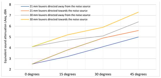 The equivalent sound attenuation (LAeq) of the analyzed structures with 15 plates and the louvers tilted at different angles.
