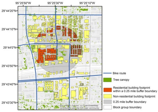 To build this index, we employed a census population at the block group level with building volume and land-use data. Through the examination of the Geographic Information System (GIS) building footprints—as well as through the utilization of data obtained by Light Detection and Ranging (LiDAR), which is a remote sensing technology—we derived estimates for the volume of each building. Subsequently, we superimposed land use data onto the buildings and identified the existence of residential properties within the buffer zones of 0.25- and 0.5-mile distances. Please refer to Figure 2 for a visual representation of this process.