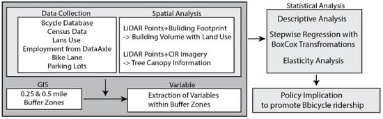 On the other hand, a 0.5-mile distance, which is influenced by the concept of transit-oriented development (TOD), is employed to establish zones of indifference for public transportation [32]. This distance serves as another benchmark for walking distances. Consequently, these two buffers around each bicycle station were used as spatial units to investigate bike-sharing ridership.