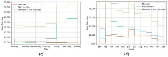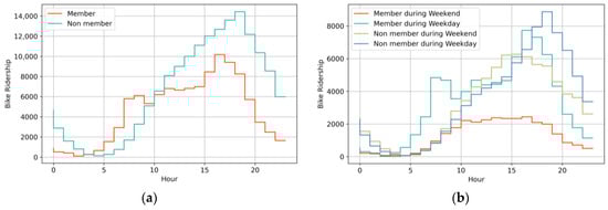 Figure 4b shows the clear usage distinctions between bike-share members and non-members. Members tended to utilize the service more prominently during weekday mornings and evenings, with reduced usage during weekends. In contrast, non-members exhibited a more consistent service usage pattern, one that was characterized by significant activity during weekday afternoons and weekends, where the peak was reached between 3 pm and 7 pm on weekends and from 6 pm to 8 pm on weekdays.