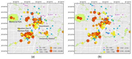 Figure 5 illustrates the spatial distribution of the bike-share ridership at stations within the Houston Beltway. It indicates that the spatial distribution of bike-share ridership exhibited similar patterns between weekdays and weekends, except for in the university district. It is evident that there was a high concentration of ridership in downtown areas and parks. However, the university district experienced more ridership during weekdays than on weekends. This suggests that there is a higher level of activity in the university district on weekdays as opposed to weekends. However, during summer and winter breaks, it is expected that the number of users will decrease significantly.