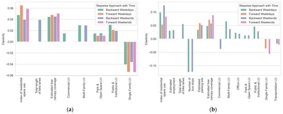 Table 2 and Table 3 offer concise summaries of the statistical results derived from the stepwise regressions for both the 0.25-mile and 0.5-mile buffer analyses. As for R2s, there was an insignificant difference between weekends and weekdays. However, we observed a slight variation, which was influenced by the choice of stepwise regression, as well as the buffer sizes (particularly the 0.25-mile and 0.5-mile options).