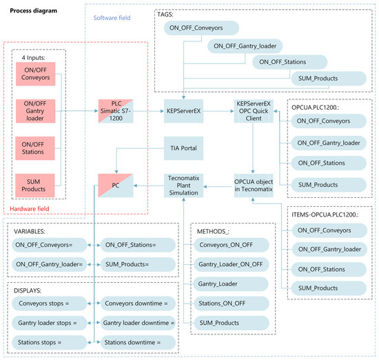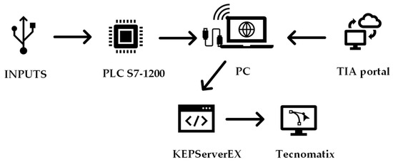 Based on the above, an empirical examination of the digital twin concept was undertaken on a hypothetical production line, employing four inputs: three mechanical limit switch buttons and one photoelectric sensor with reflex detection. The integration of these inputs was achieved through a SIEMENS PLC SIMATIC S7-1200 manufactured by Siemens, establishing connectivity via an Ethernet cable directly linked to a laptop. The production line visualisation and simulation were conducted using Siemens Tecnomatix Plant Simulation, supported by additional application resources such as SIEMENS TIA portal and PTC Kepware KEPServerEX. We opted for these methods because Tecnomatix Plant Simulation is a powerful tool that offers comprehensive capabilities for modeling and simulating production systems [35]. In conjunction with the TIA Portal, Tecnomatix enables the design and simulation of manufacturing systems while directly interfacing with PLCs. This integration ensures that the simulated model accurately reflects the behaviour of the real-world production line. KEPServerEx is chosen due to its ability to provide a unified source of industrial data to all automation devices with limitless tag support. Unlike other OPC servers, KEPServerEx maintains consistent speed regardless of tag count [38]. Integrating KEPServerEX and TIA Portal with Tecnomatix Plant Simulation creates a robust simulation environment. The scheme presenting the structure and connections of the digital twin is shown in Figure 1.