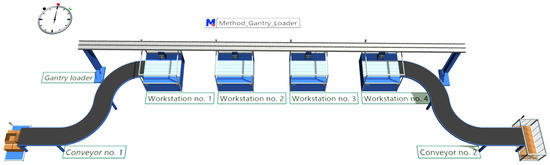 In Tecnomatix Plant Simulation, the DT of a production line is modelled featuring four workstations served using a gantry loader, supplemented through two conveyors (Figure 2). Initial products for processing are directed to workstation no. 1. Part moving between workstations no. 1 to no. 4 is executed via a gantry loader equipped with two heads. Upon completion of processing at workstation no. 4, parts are automatically conveyed away.