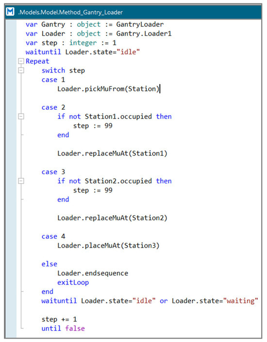In the basic model of DT (Figure 2), a singular method, namely the initialisation method denoted by Method_Gantry_Loader (Figure 3), is used to control the movement of the gantry loader, manipulation of parts, and relocation of the gantry loader between workstations. To ensure the proper functioning of this method, it must be defined on the first workstation (Controls—Exit: Method_Gantry_Loader).