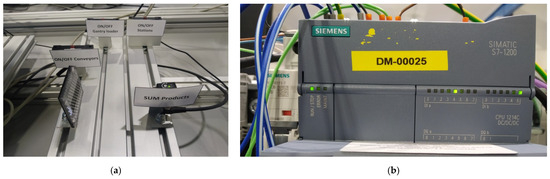 In our scenario, the hypothetical production line, whose DT is modelled in Tecnomatix, is represented by four inputs, encompassing two types: mechanical limit switches and a photoelectric sensor with reflex detection. The three mechanical limit switches are determined to stop the machines and are designated for each type of machine, namely conveyors, the gantry loader, and workstations. The remaining input, represented by the photoelectric sensor, is designated to tally finished products after their final processing stage.