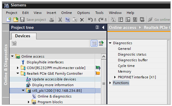 The Totally Integrated Automation (TIA) Portal provides unrestricted access to a complete spectrum of digitised automation services, ranging from digital planning to integrated engineering and transparent operation [41]. Its role in our context is the acquisition of the IP address for the PLC S7-1200.