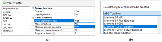 Commencing the KEPServerEX application, we initiate the process by creating a new project. Within the project properties, the parameter “Allow anonymous login” is configured with a value of YES (Figure 7a). Subsequently, we proceed to establish a communication channel, opting for the “Siemens TCP/IP Ethernet” selection, given the utilisation of a Siemens PLC in our setup (Figure 7b). The remaining settings are maintained at their default configurations.