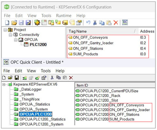 KEPServerEX provides a single source of industrial automation data for your application. It enables users to connect, manage, monitor, and control diverse automation devices and software applications through a unified and user-friendly interface. KEPServerEX leverages OPC (the automation industry’s standard for interoperability) and IT-centric communication protocols to provide users with a single source for industrial data [40]. In our case, KEPServerEX functions as the intermediary linking Tecnomatix Plant Simulation and PLC Simatic S7-1200 manufactured by Siemens.