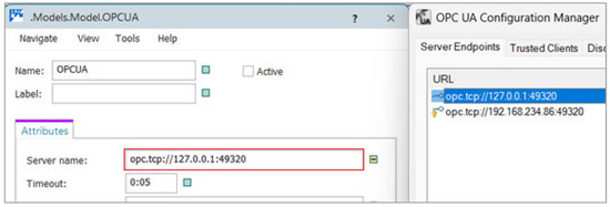 In order to receive real input data into the Tecnomatix model, we attach the OPC UA object to the model in Tecnomatix (located in Toolbox—Information Flow—OPC UA). The OPC UA interface is an interface between Plant Simulation and control and automation technology systems, facilitating the exchange and access of data. It enables access to process monitors, particularly PLC controls, through the OPC Unified Architecture. The OPC UA Interface functions as a client, capable of both reading and writing control variables and signals of PLC controls. The term “OPC” stands for Open Platform Communications [39]. The embedded OPC UA object is designed to communicate with the KEPServerEX software V6.14.263.0, which serves as an intermediary, receiving data from Siemens PLC.