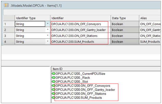 As previously explained, the integration of the OPCUA object serves as the conduit for establishing connectivity with the KEPServerEX application. The “Server name” within the OPC UA object must align precisely with the data within the OPC UA Configuration Manager of the KEPServerEX application (Figure 9). When selecting “PLC1200” within the OPCUA object, a novel table is opened, wherein the definition of TAGS sourced from the Quick Client of the KEPServerEX application is executed. Notably, the TAGS (Item ID) from Quick Client must also have the same names in Tecnomatix in the OPCUA object under “PLC1200” in the “Identifier” column (Figure 10).