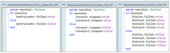 In the Tecnomatix model, three button inputs were utilised, namely “ON/OFF Conveyors”, “ON/OFF Gantry Loader”, and “ON/OFF Stations”, defined as global variables denoted as ON_OFF_Conveyors, ON_OFF_Gantry_Loader, and ON_OFF_Stations, respectively. These variables are of a boolean data type, initialised with a default value of “false”. Within this triad of variables, the incorporation of “Observers” is facilitated through the “Tools”, wherein a predefined value (“Value”) is specified to invoke the associated method upon any alteration in the variable’s state. This mechanism performs adjustments in the operational behaviour of the conveyors, gantry loader, and workstations in response to modifications in the corresponding variables. The specific methods activated in this context are denoted as Method_Conveyors_ON_OFF, Method_Gantry_Loader_ON_OFF, and Method_Stations_ON_OFF (Figure 11).