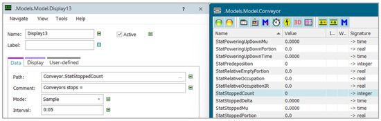 The subsequent step entails the establishment of counters for the downtime instances of individual equipment categories, specifically, “Conveyors stops”, “Gantry loader stops”, and “Stations stops”. Additionally, the total downtime for each equipment category, namely “Conveyors downtime”, “Gantry loader downtime”, and “Stations downtime”, is set. This is achieved through displays, accessed via “Toolbox—User interface—Display”. Within these displays, the attributes to be monitored are specified.