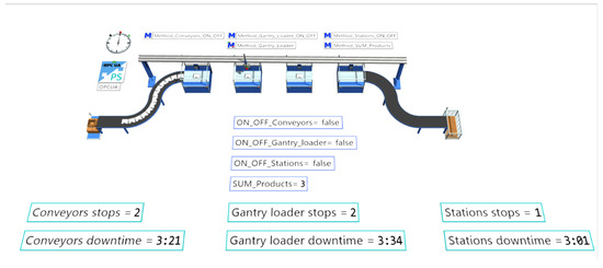 Drawing upon our designated inputs and the created model, the monitoring system in Tecnomatix includes ten attributes, observed and analysed for operational insights: the current state of conveyors (in service or out), the current state of the gantry loader (in service or out), the current state of workstations (in service or out), number of manufactured products, number of conveyor stops, total downtime of conveyors, number of gantry loader stops, total downtime of gantry loader, number of workstations stops, and total downtime of workstations.