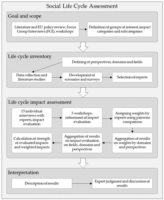 The methodology of S-LCA is not standardized, as is the case with the environmental and economic methods: life cycle assessment (E-LCA or LCA) and life cycle costing (LCC). There is neither consensus on the methods of social impact assessment nor clarity on the underlying concepts of social sustainability. As a result, many different methods have been proposed, with different objectives focusing on different aspects [44]. Some of the methodological approaches of the S-LCA are based on the knowledge of the experts and their active participation [45]. This is due to the social effects, which depend not only on the production processes themselves but often also on the behavior of the actors and the specific contexts.