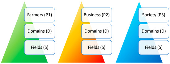 The farmer’s perspective (P1) consists of 3 domains (D11, D12, D13).