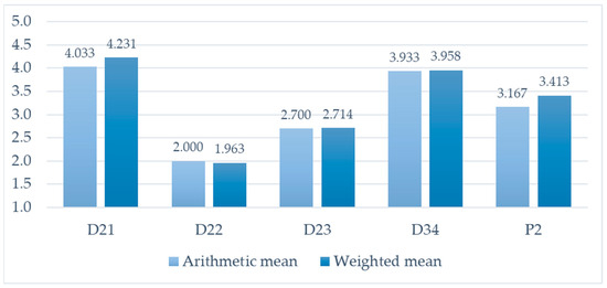 The weights calculated by pairwise comparison were also used to check whether the introduction of preferences affects the evaluated impacts. The weighted means of the impacts () were calculated according to the formula: