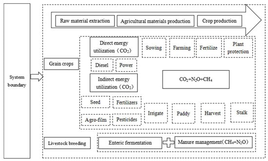 In summary, the existing studies have significantly contributed to enhancing the theoretical framework of China’s agricultural greenhouse gas emissions. They provide a solid theoretical basis and serve as valuable references for subsequent research. However, there are certain limitations that need to be addressed. Currently, most of the agricultural GHG emission accounting studies primarily rely on the emission factor method recommended by the IPCC. This approach only considers emissions from specific agricultural activities, resulting in a less comprehensive assessment. Moreover, these studies tend to focus solely on one or a few types of crops or livestock without considering the plantation industry and animal husbandry as an integrated system. Additionally, most research efforts concentrate on national or provincial scales, with limited coverage of greenhouse gases at a national level [,], and use only relatively short study periods. Therefore, this paper will adopt the life cycle assessment methodology to comprehensively and accurately quantify greenhouse gas emissions from crops and livestock throughout their entire growth process. It aims to assess the greenhouse gas emissions of China’s plantation and livestock industries during 2000–2020, elucidating the spatial, temporal, and structural evolution of agricultural greenhouse gas emissions in China. The objective is to precisely comprehend the trends in agricultural greenhouse gas changes and the current situation of China’s agricultural environment, while providing theoretical guidance for scientifically formulating measures to reduce agricultural greenhouse gas emissions. This study not only enhances the research framework of agricultural greenhouse gas emissions but also offers valuable insights for future investigations. It fosters innovation in agricultural technology and provides essential data to support the development of emission reduction policies. Additionally, it enhances the international attention to the issue of agricultural greenhouse gas emissions, promotes international cooperation and exchanges, and collectively contributes to achieving China’s and other nations’ targets for reducing agricultural greenhouse gas emissions, thereby making a positive impact on addressing the challenges of global climate change.