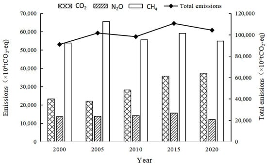 China’s agricultural greenhouse gas emissions showed a fluctuating upward trajectory from 2000 to 2020 (Figure 2), witnessing a rise in total emissions from 910,047,100 tons of CO2-eq to 1,043,352,200 tons of CO2-eq. The growth rate of agricultural greenhouse gas emissions from 2000 to 2005 reached a significant high of 11.72%, with an average annual growth rate of 2.3%. This surge can be attributed primary to China’s prioritization of agricultural development during that period and gradual implementation of the “two reductions, three subsidies” policy, which effectively incentivized farmers to increase food production but also let to a notable rise in greenhouse gas emissions. From 2005 to 2010, there was a significant reduction agricultural GHG emissions, with a low growth rate of −3.3%. The No. 1 Central Document from 2006 onwards emphasized the promotion of resource-emphasized and sustainable development in agricultural technology, curbing high-emission and high-pollution inputs. Additionally, the State Council’s Opinions on Promoting the Sustainable and Healthy Development of the Animal Husbandry Industry in 2007 underscored the need for restructuring this industry, leading to a decrease in the livestock breeding scale and ultimately resulting in reduced emissions []. From 2010 to 2015, agricultural greenhouse gas emissions experienced a resumption of growth, with an average annual growth rate of 2.5%, which was driven by the expansion of agricultural production. As a result of the implementation of various stimulus packages by countries in response to the 2008 financial crisis aimed at improving the economic situation, there has been a shift in the rural labor force towards non-agricultural sectors. This has resulted in an increase in agricultural input factors to compensate for labor shortages and ensure an adequate supply of crucial agricultural products, consequently leading to a rise in greenhouse gas emissions from agriculture. From 2015 to 2020, agricultural greenhouse gas emissions experienced a decline, primarily attributed to the No. 1 Central Document’s increased focus on sustainable agriculture development and environmental management since 2014. The subsequent introduction of the rural revitalization strategy in 2017, with ecological livability as its cornerstone, further propelled green development initiatives within the agricultural sector. This concerted effort effectively demonstrated the efficacy of emission reduction concepts and policies, resulting in a notable decrease in agricultural greenhouse gas emissions during this period.