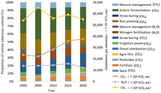 Greenhouse gas emission structure of different agricultural production activities from 2000 to 2020.