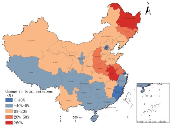 Change in total agricultural greenhouse gas emissions in China, 2000–2020. Note: The map has been generated using the unaltered standard map with review number GS (2019) 1822, obtained from the Standard Map Service website of the State Administration of Surveying, Mapping and Geographic Information. The same as below.