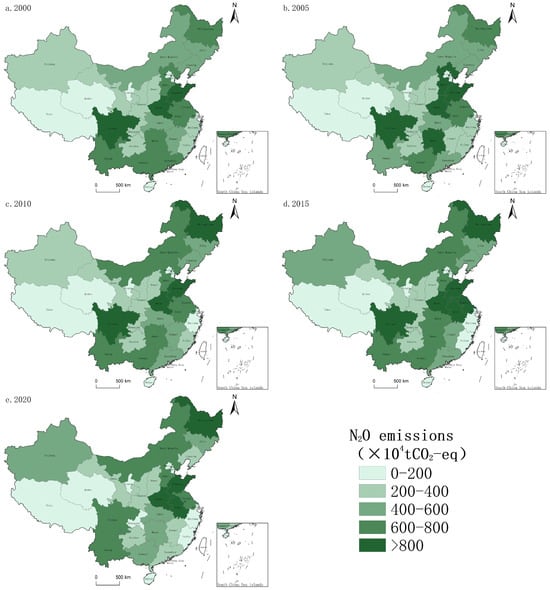 Spatial distribution of agricultural N2O emissions in China, 2000–2020.