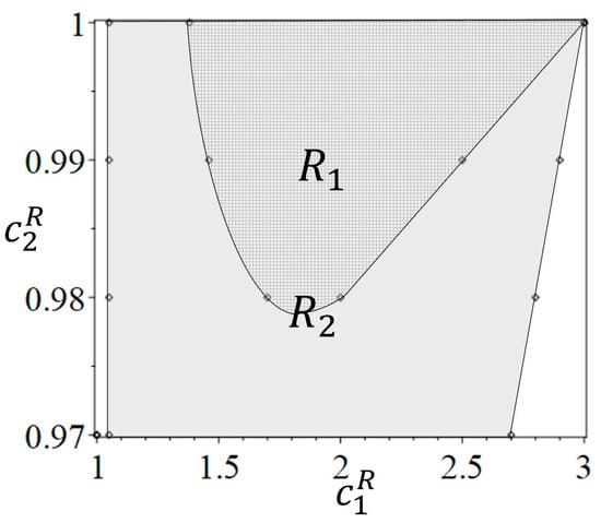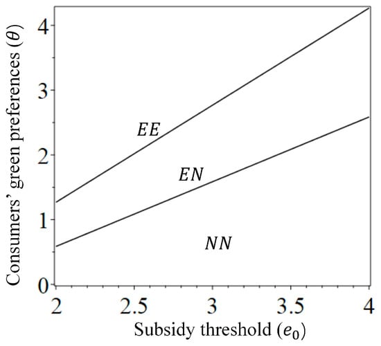 According to Proposition 2, Figure 1 displays the Nash equilibrium production decisions of both firms where the parameters are set. As the threshold level for the subsidy increases, both firms’ equilibrium product strategies show a changing trend of . It is worth noting that Case does not belong to the equilibriums. This is because that it is evident that if firm 2, with lower green technology capability, adopts a technology-leading strategy, it will suffer from cost disadvantages and profit loss. Moreover, a sufficiently high threshold level for the subsidy (i.e., ) will lead to Case in which the SCS policy loses its incentive effect on firms’ R&D and there will be no difference between Case and the non-SCS case. Therefore, we define an efficient SCS policy satisfying where ).