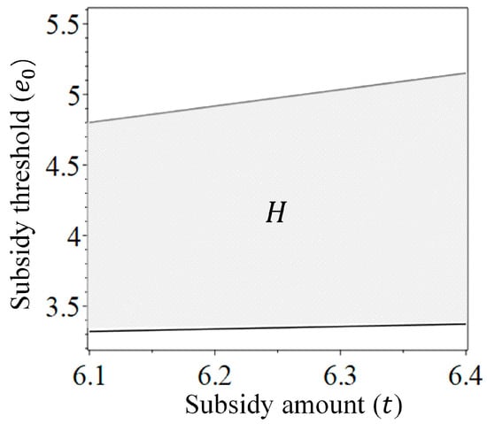 The analysis of Corollary 2 suggests that, unlike Proposition 1, adjusting the subsidy threshold and amount under SCS policy can affect the environmental benefits. This provides valuable reference for the government when making policies. Giving the parameters values such as , we can depict the effect of changes in SCS policy on the interval of environmental benefit loss in Figure 4. It is evident that reducing lessens the damage range of environmental benefits, as the negative impact of technological improvement on environmental benefits weakens when the subsidy amount is reduced. However, it is important to note that in the situation, raising the subsidy threshold can improve environmental benefits only when consumers have a strong brand preference. In addition, if the situation is , when most firms have a mature technology level and can easily obtain subsidies, regulating the subsidy threshold and amount cannot reduce losses. This suggests that government policies cannot remain unchanged with technological improvement, and it is necessary to regulate the subsidy threshold and subsidy amount to reduce the loss of environmental benefits to a certain extent.